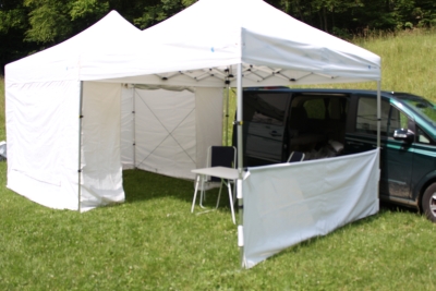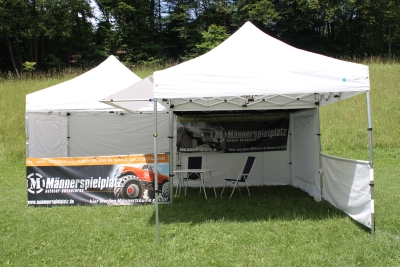Das erste Faltzelt mit Wänden und Tür als „Wohnbereich“ das zweite Faltzelt mit Zubehör „Markise“ und Tresen/halbe Wand Als „überdachte Terrasse.