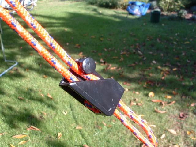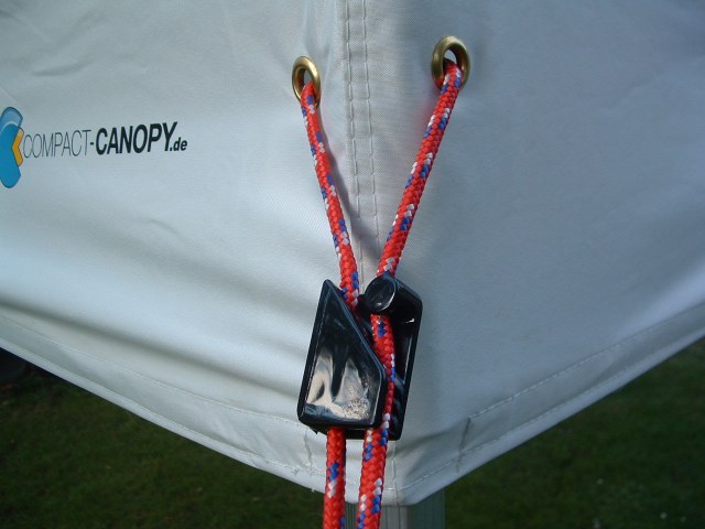 Wer es jedoch schnell und einfach liebt, der beschafft sich Leine mit 7-10mm Durchmesser und 4 Volleyball-Netz-Klemmen. Die Klemme wird mit einem Knoten auf der Leine fixiet. Am besten so, dass zum Hering ca. 2 m Platz ist. Dann das andere Ende beim Aufbau nur noch durch die Ösen schieben und einklemmen.