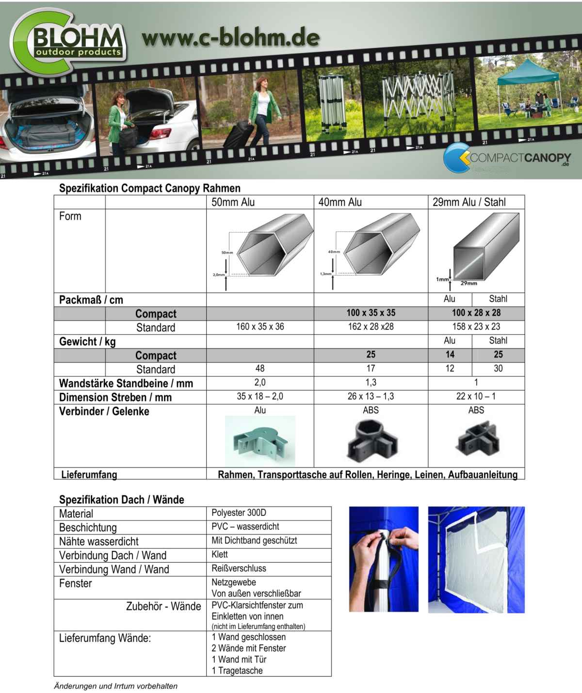 Wie Sie vielleicht schon gelesen haben, arbeiten wir selber mit den Faltzelten, kennen sie also in- und auswändig. Da wir dafür den 40mm 6-Kant Alu-Rahmen Compact Canopy verwenden sind wir gegenüber den 29mm-Rahmen aus Stahl oder Alu befangen.