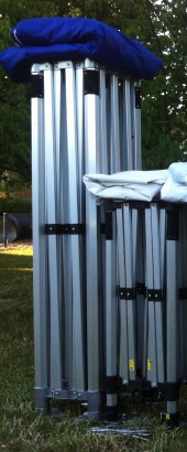 - Das Dach wird häufig auf dem Rahmen gelassen. Es besteht das Risiko, dass die Dachplane zwischen den Dachstreben des Faltzeltes eingeklemmt und beschädigt wird. Lässt man das Dach auf dem Rahmen für den Transport, geht der Aufbau schneller als bei Compact Canopy Faltzelten mit 1m Packmaß.