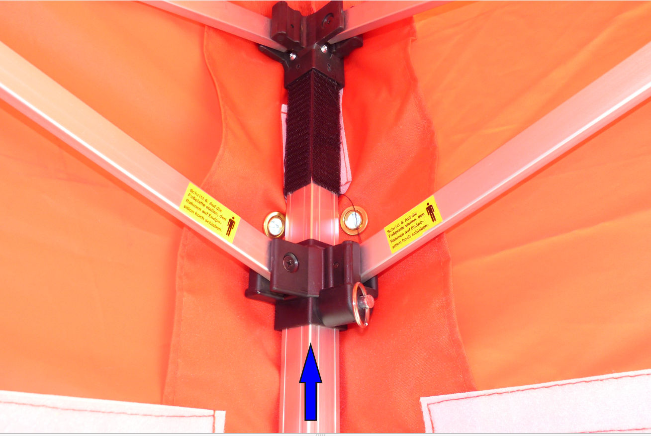 Insbesondere beim Aufbau, wenn die Rasterung für die Dachspannung die letzten 3-4cm hoch gedückt wird, bedeutet dies ein Plus für die Stabilität und Sicherheit des Faltzeltes.