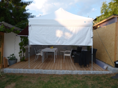 Später dann, wenn die Sonne weiter gezogen ist und die Luft sich abkühlt, setzten Sie die halbe Wand einfach wieder nach unten und das Gäste im Faltzelt sind gut gegen den kalten Luftzug geschützt. So bleibt man gerne