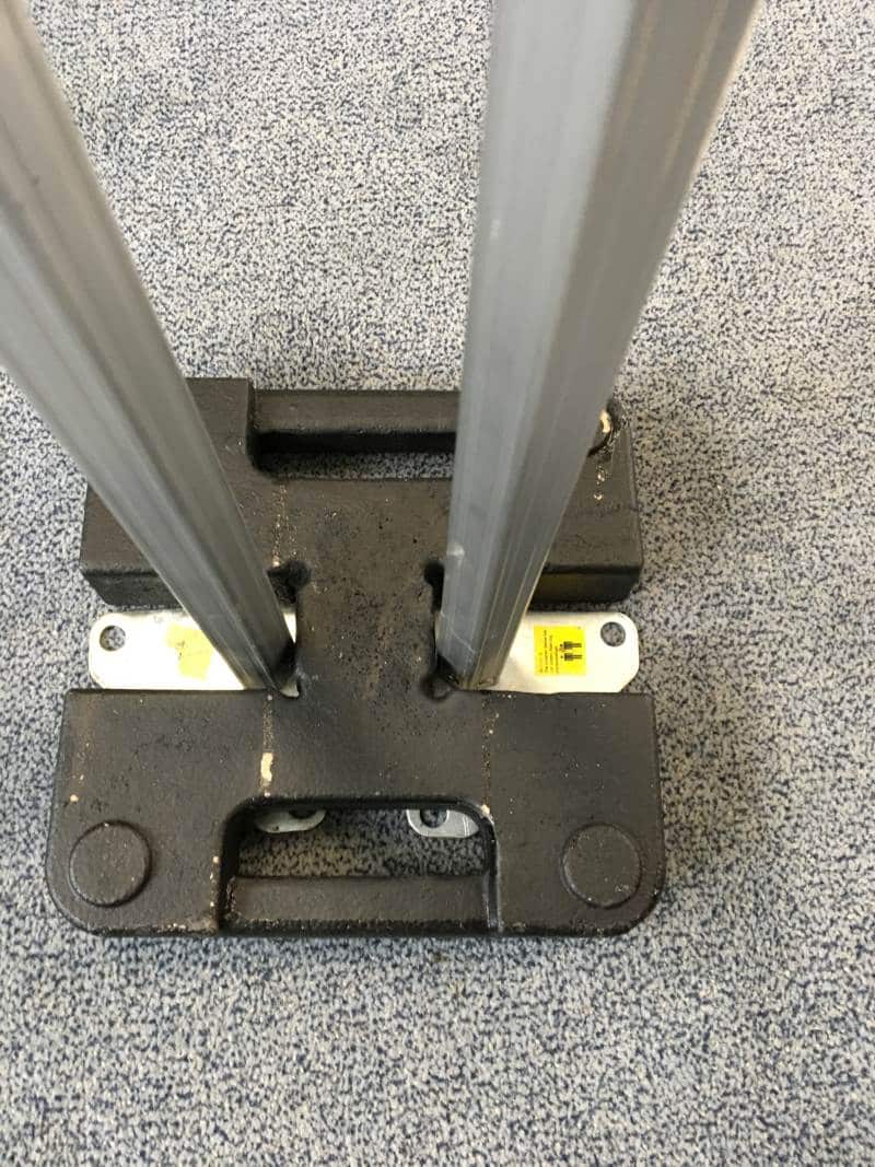 Durch die beiden ca. 55mm breiten Einschübe eignet sich das Gewicht sehr gut an Positionen, wo 2 Faltzelte zusammen gestellt werden, damit aus zwei 3x3m Einheiten eine 3x6m Einheit wird.