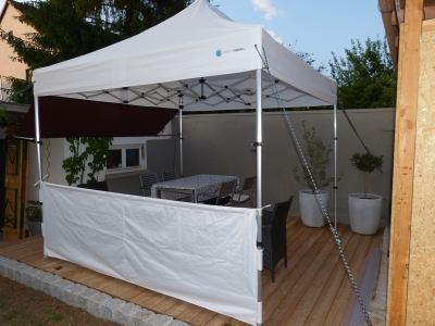 3. Beschichtete Planen machen das Partyzelt wasserdicht: Gewebestoff aus Polyester, der mit einer geschlossenen Beschichtung versehen ist. Die Beschichtung ist mit dem Stoff fest verbunden.
