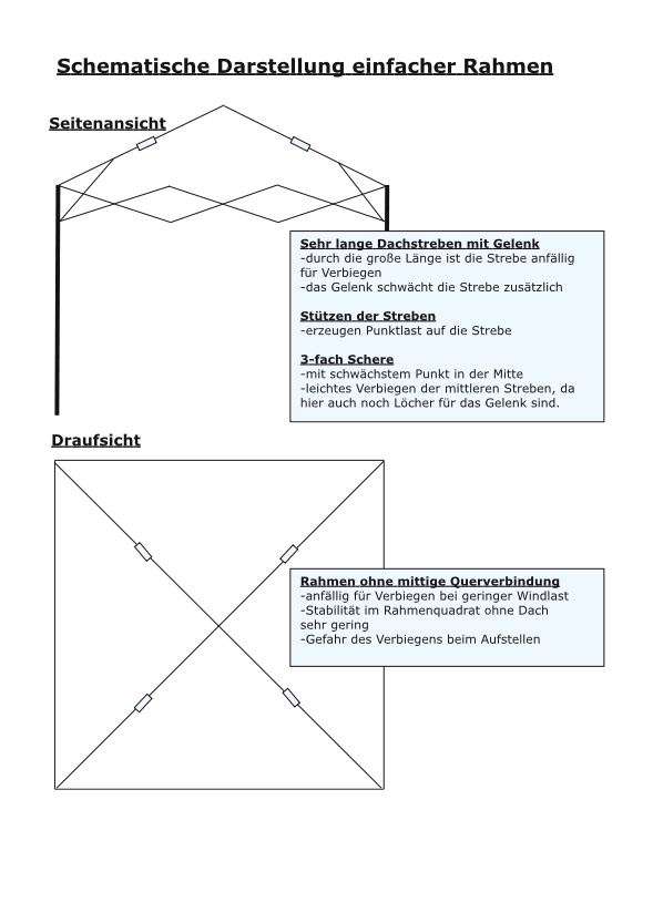 Damit dann der Zielpreis erreicht wird, mus alles so schnell, wie möglich und mit wenigen Arbeitsschritten zusammengebaut sein. Daraus ergibt sich dann die Konstruktion dieser einfachen Zelte. Diese Konstruktion mit „Sparmaterial“ kann natürlich nicht das Gleiche bieten, wie ein Faltzelt für das Doppelte und mehr.